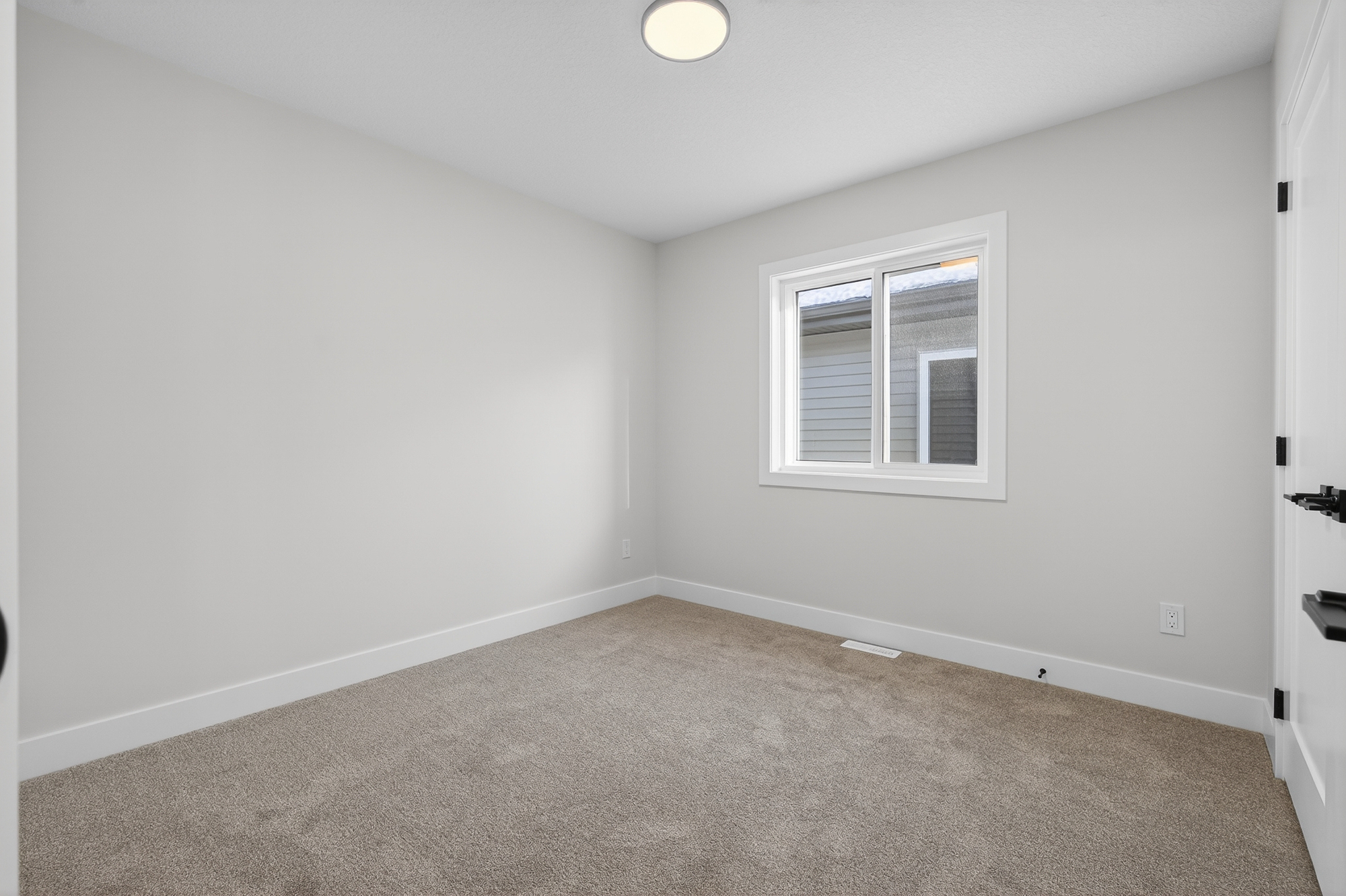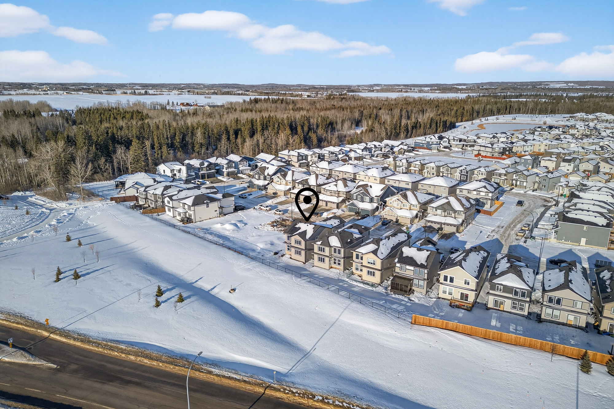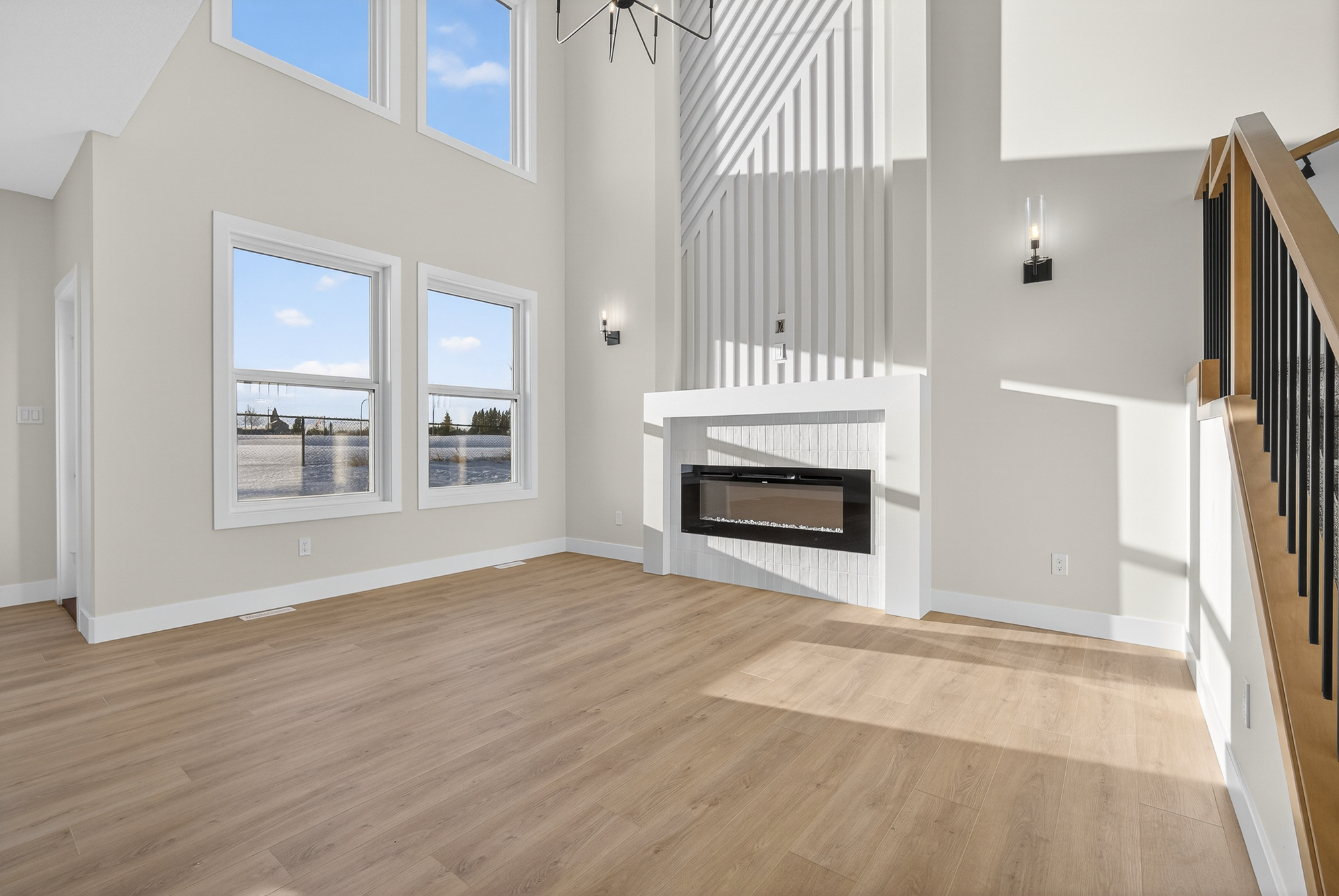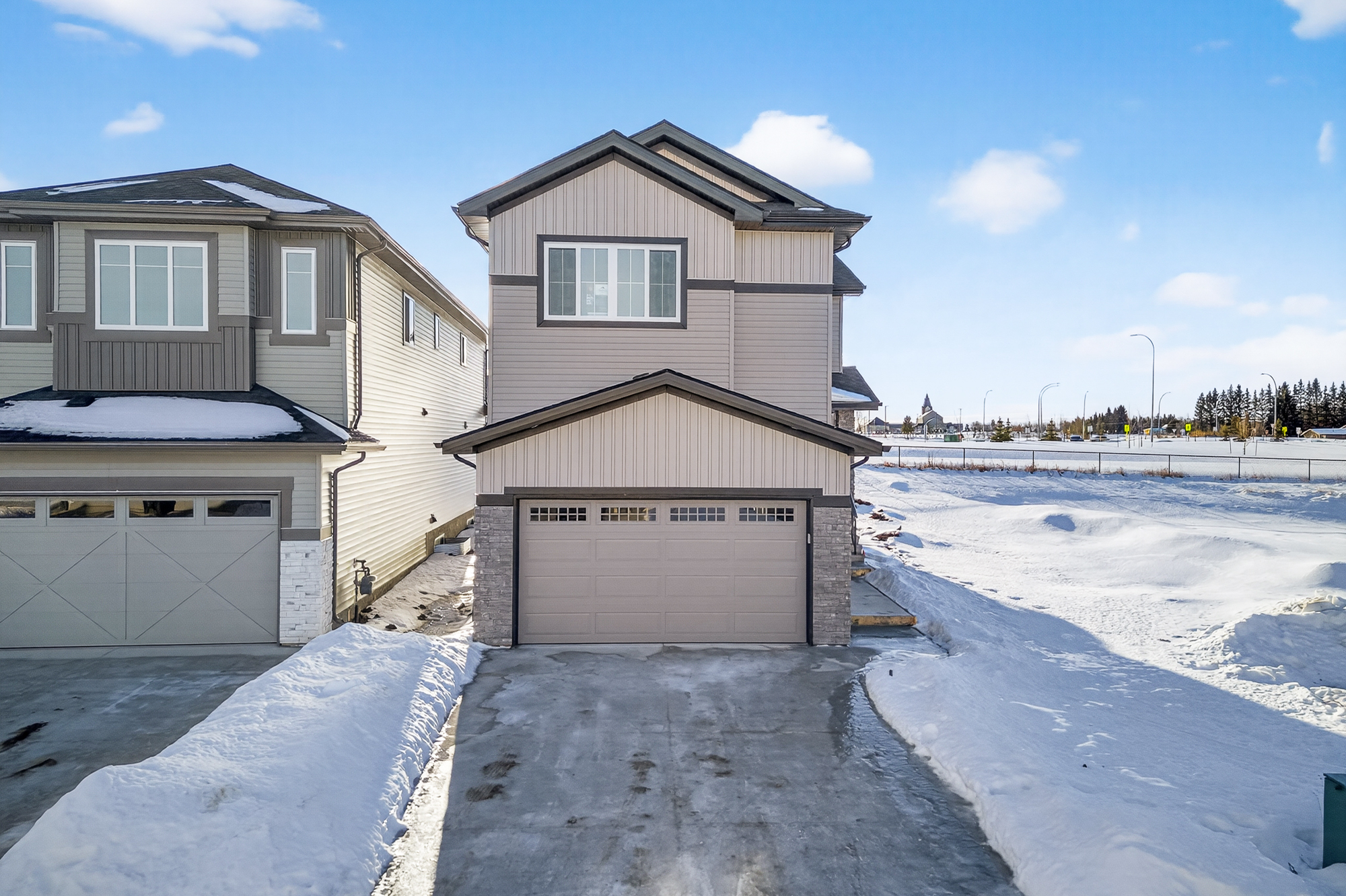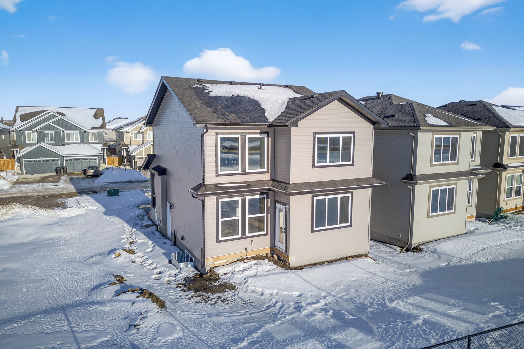 Experience this stunning New Era home with no rear neighbors, offering exceptional privacy and modern design. Thoughtfully crafted with an open-concept layout, the home features 9′ ceilings on the main and basement levels and a dramatic open-to-above great room complete with an electric fireplace and custom feature wall. The main floor offers a versatile den or optional fourth bedroom, a convenient half bath, and a chef-inspired kitchen showcasing quartz countertops and full-height cabinetry. Upstairs, enjoy a spacious bonus room with a tray ceiling, three well-appointed bedrooms, and a laundry room that connects directly to the primary ensuite for added convenience. The primary retreat features dual sinks, a freestanding soaker tub, and a tiled shower, creating a true spa-like experience. Additional highlights include a separate side entrance, tankless gas hot water system, MDF shelving, and an unfinished basement ready for your personal touch. MOVE-IN READY