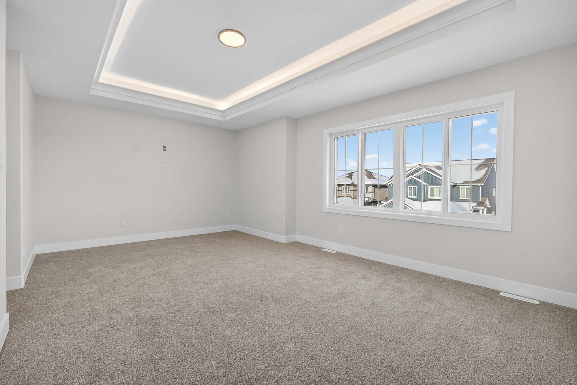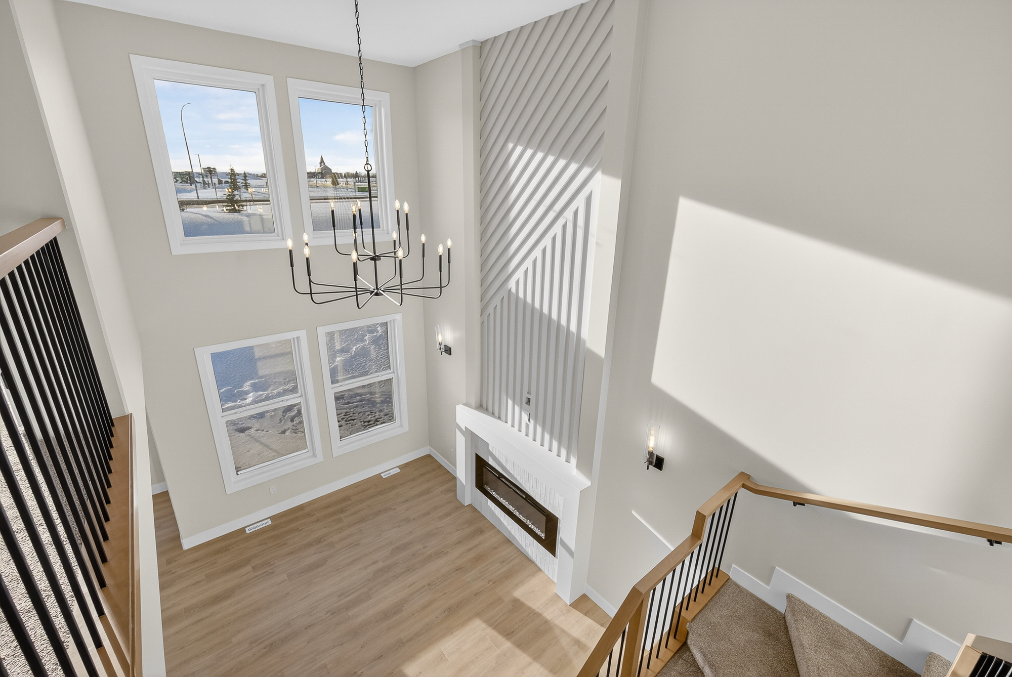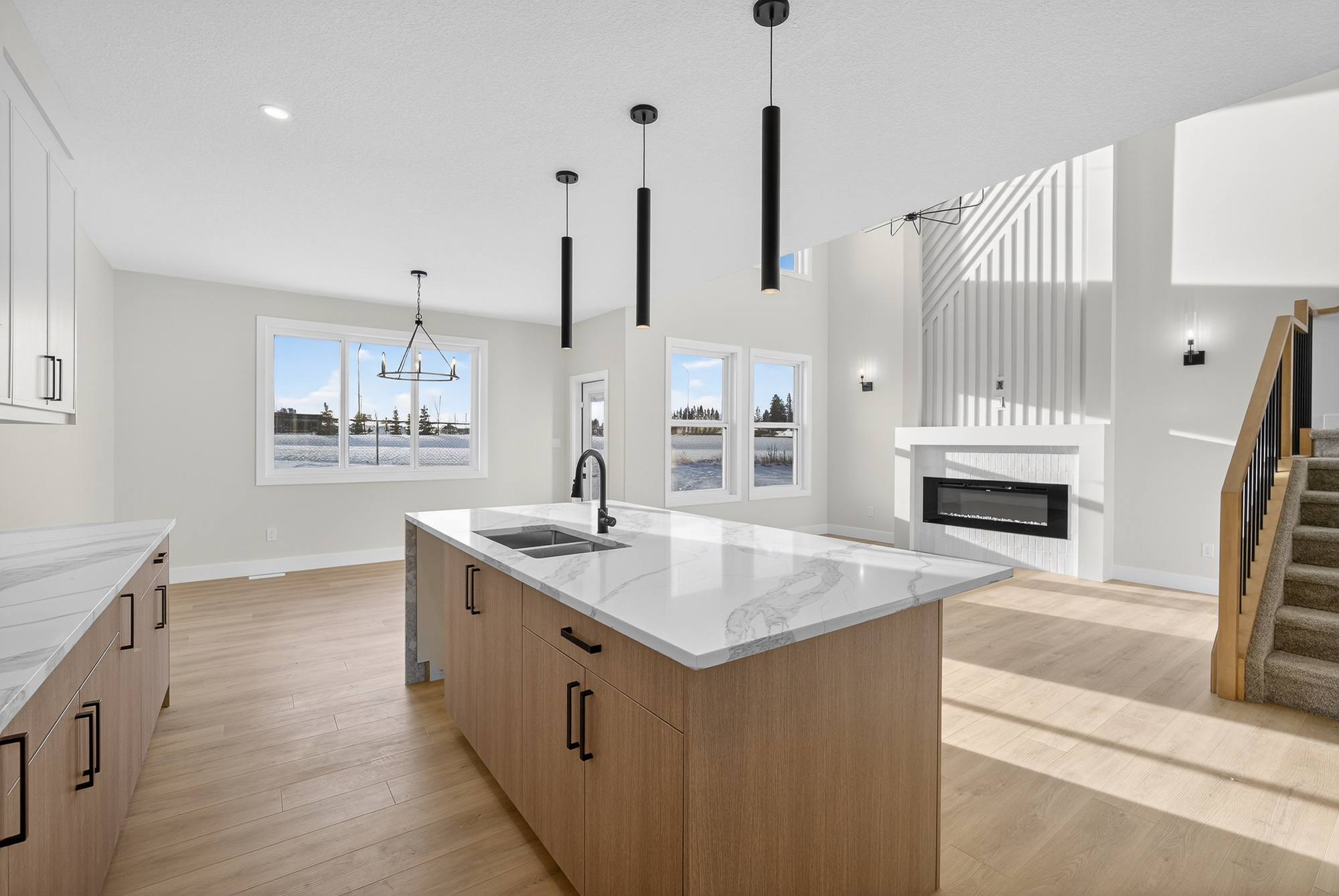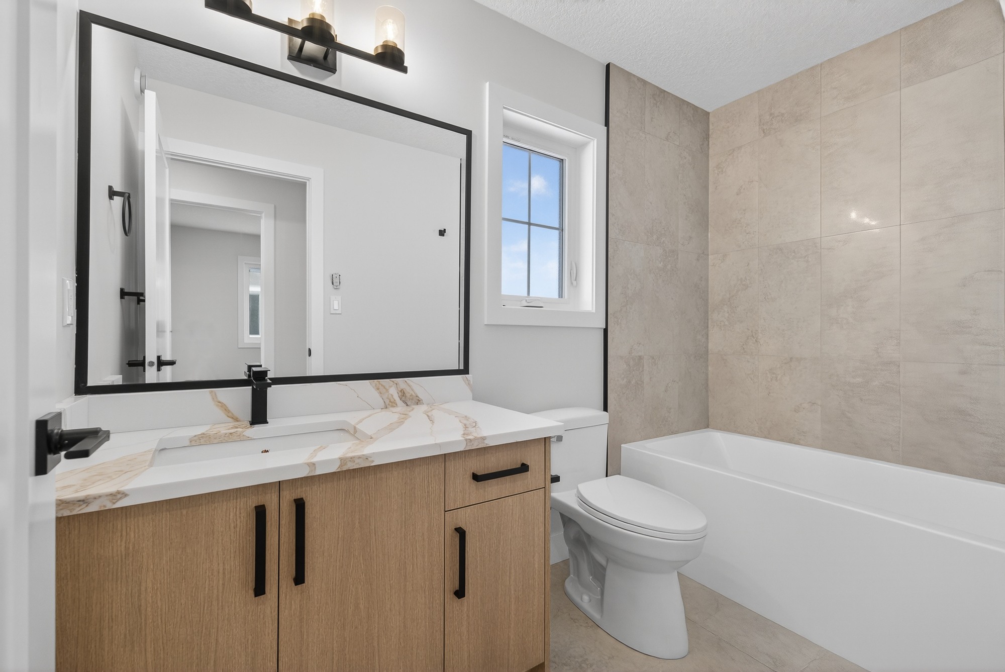 Experience this stunning New Era home with no rear neighbors, offering exceptional privacy and modern design. Thoughtfully crafted with an open-concept layout, the home features 9′ ceilings on the main and basement levels and a dramatic open-to-above great room complete with an electric fireplace and custom feature wall. The main floor offers a versatile den or optional fourth bedroom, a convenient half bath, and a chef-inspired kitchen showcasing quartz countertops and full-height cabinetry. Upstairs, enjoy a spacious bonus room with a tray ceiling, three well-appointed bedrooms, and a laundry room that connects directly to the primary ensuite for added convenience. The primary retreat features dual sinks, a freestanding soaker tub, and a tiled shower, creating a true spa-like experience. Additional highlights include a separate side entrance, tankless gas hot water system, MDF shelving, and an unfinished basement ready for your personal touch. MOVE-IN READY